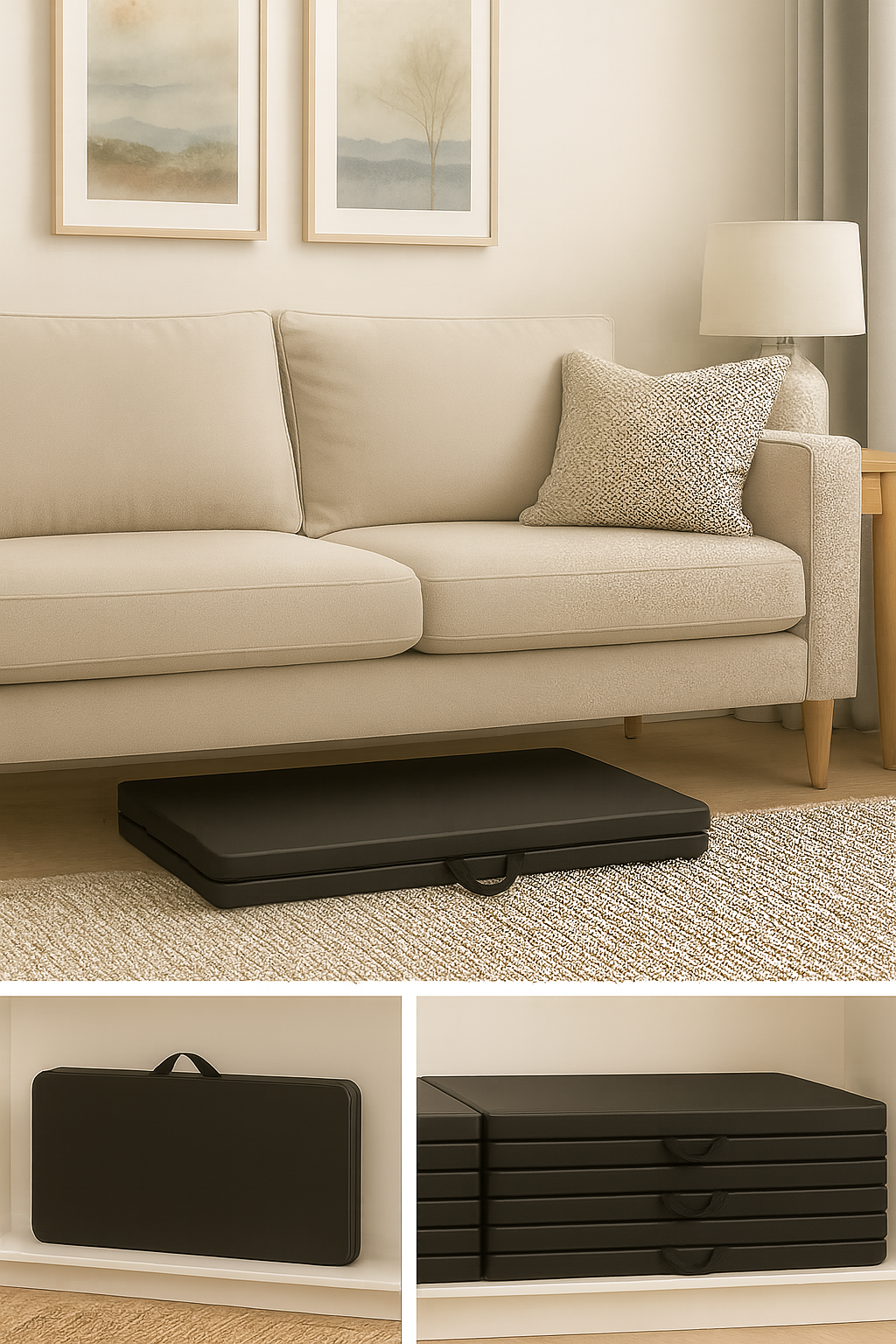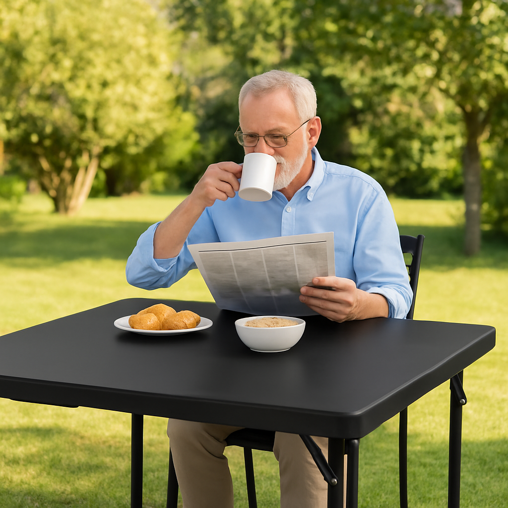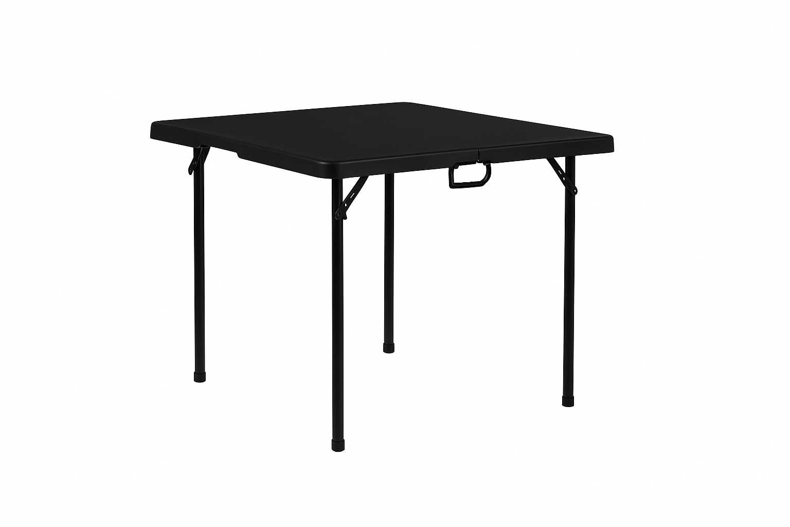 Introducing the 34" Square Black Plastic Folding Table! . — portable, foldable design folds in half for compact storage and easy transport. This versatile table is perfect for any occasion, whether you're hosting a dinner party, hosting a meeting at the office, or simply need some extra surface space in your home. 34x34 inch table with 29.5 inches in height, Tabletop made from 40mm thick durable plastic, and Black color make it a stylish and modern addition to any space. Made from durable plastic, this folding table is easy to clean and maintain. It's also lightweight and portable, making it easy to move from one room to another or to take with you on the go. Whether you need a quick seating arrangement or need a convenient workspace table, this 3.2-Foot Plastic Table is sure to be a practical and stylish solution. Requires no assembly, so you can start using it right out of the box. Simply unfold the legs and you're ready to go. This makes it a convenient choice for those who don't want to spend time putting a table together or for those who may not have the necessary tools. Durable Angled braces at corners for extra stability, gray powder coated steel tube with 0.9mm thickness and safety locking legs mechanism for long lasting use. In addition to its easy setup, this table is also easy to store when not in use. Simply fold the legs and you can tuck it away in a closet or under a bed. It's a space-saving solution that is perfect for small space, apartments or a temporary workspace. Additionally, each foot has a rubber cap that improves traction on slippery surfaces while shielding floors from dents and scratches. Compact & Strong – Measures 34” x 34” x 29.5” and fits up to 4 adults. Folded size is 34” x 17” x 3.3”, easily fitting in most car trunks. Weighs just 18 lbs with dynamic load capacity of 75 lbs and static load up to 330 lbs. Lightweight, portable, and totally pre-assembled for instant use. Non-slip rubber feet prevent sliding and protect floors.