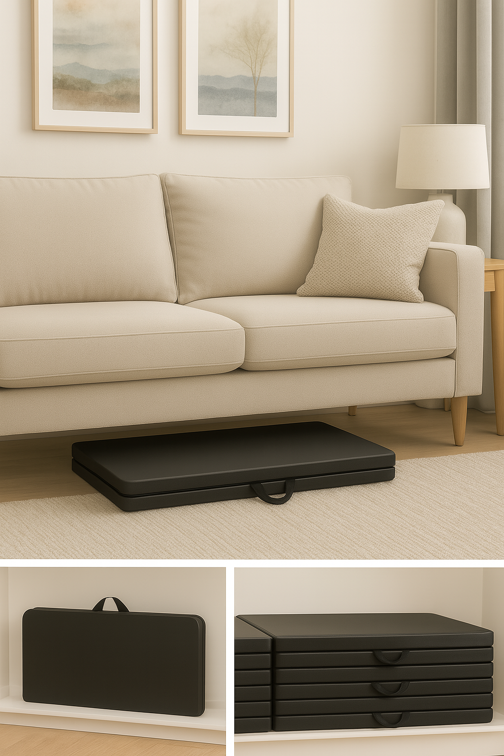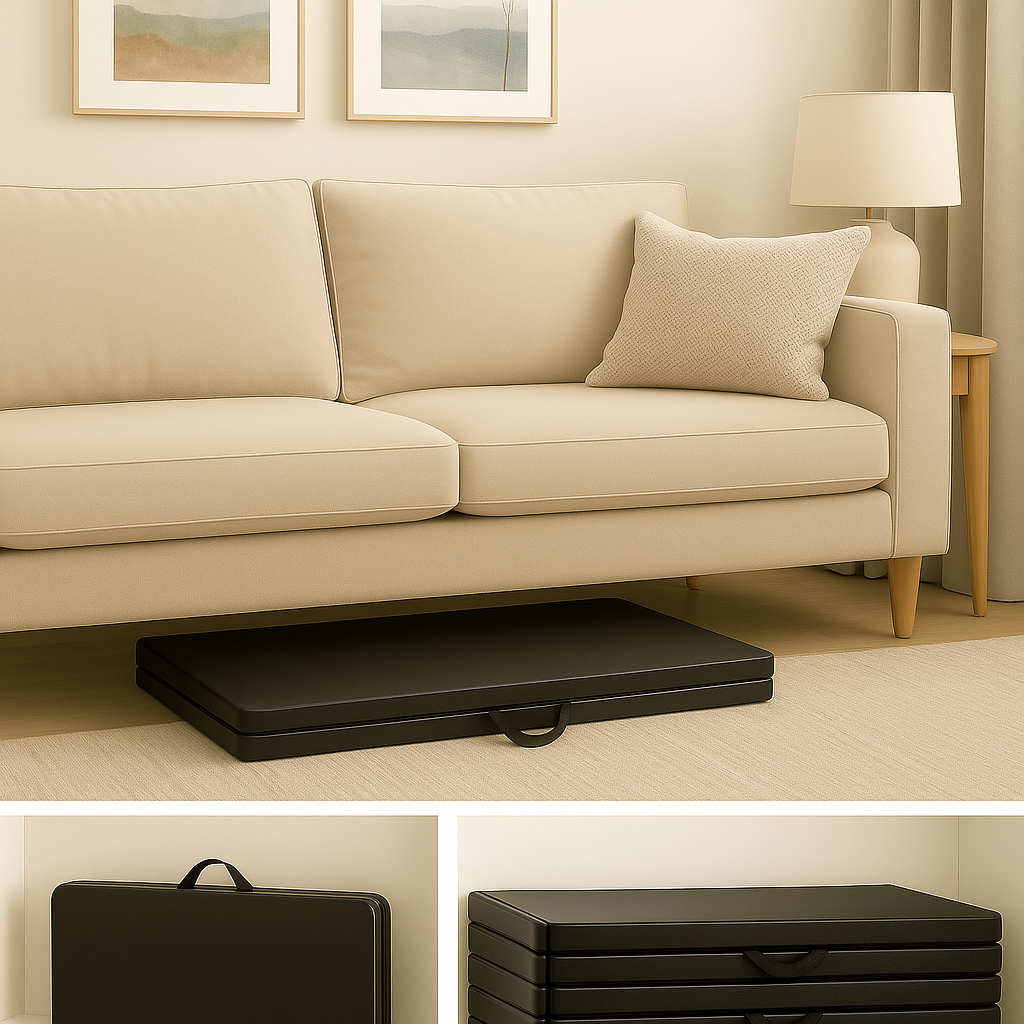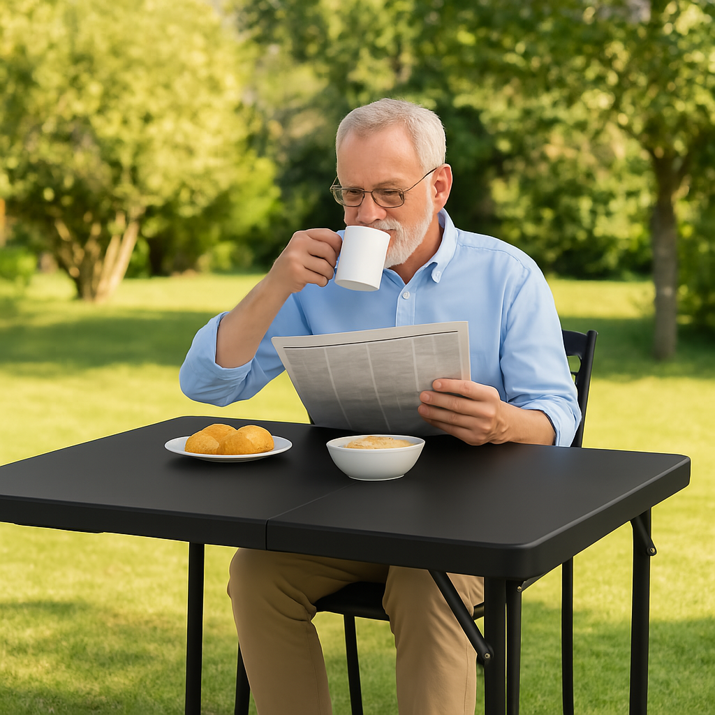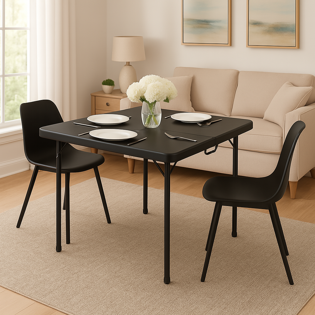Introducing the 34" Square Black Plastic Folding Table! . — portable, foldable design folds in half for compact storage and easy transport. This versatile table is perfect for any occasion, whether you're hosting a dinner party, hosting a meeting at the office, or simply need some extra surface space in your home. 34x34 inch table with 29.5 inches in height, Tabletop made from 40mm thick durable plastic, and Black color make it a stylish and modern addition to any space. Made from durable plastic, this folding table is easy to clean and maintain. It's also lightweight and portable, making it easy to move from one room to another or to take with you on the go. Whether you need a quick seating arrangement or need a convenient workspace table, this 3.2-Foot Plastic Table is sure to be a practical and stylish solution. Requires no assembly, so you can start using it right out of the box. Simply unfold the legs and you're ready to go. This makes it a convenient choice for those who don't want to spend time putting a table together or for those who may not have the necessary tools. Durable Angled braces at corners for extra stability, gray powder coated steel tube with 0.9mm thickness and safety locking legs mechanism for long lasting use. In addition to its easy setup, this table is also easy to store when not in use. Simply fold the legs and you can tuck it away in a closet or under a bed. It's a space-saving solution that is perfect for small space, apartments or a temporary workspace. Additionally, each foot has a rubber cap that improves traction on slippery surfaces while shielding floors from dents and scratches. Compact & Strong – Measures 34” x 34” x 29.5” and fits up to 4 adults. Folded size is 34” x 17” x 3.3”, easily fitting in most car trunks. Weighs just 18 lbs with dynamic load capacity of 75 lbs and static load up to 330 lbs. Lightweight, portable, and totally pre-assembled for instant use. Non-slip rubber feet prevent sliding and protect floors.