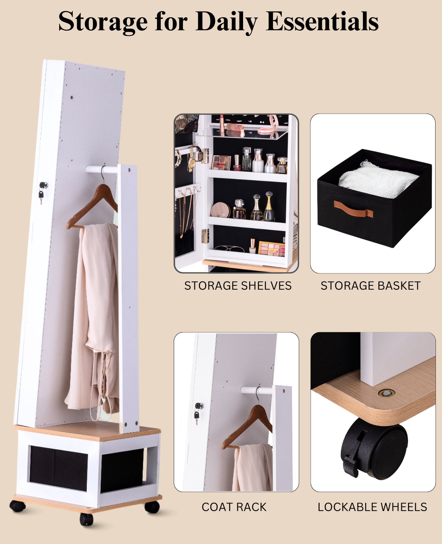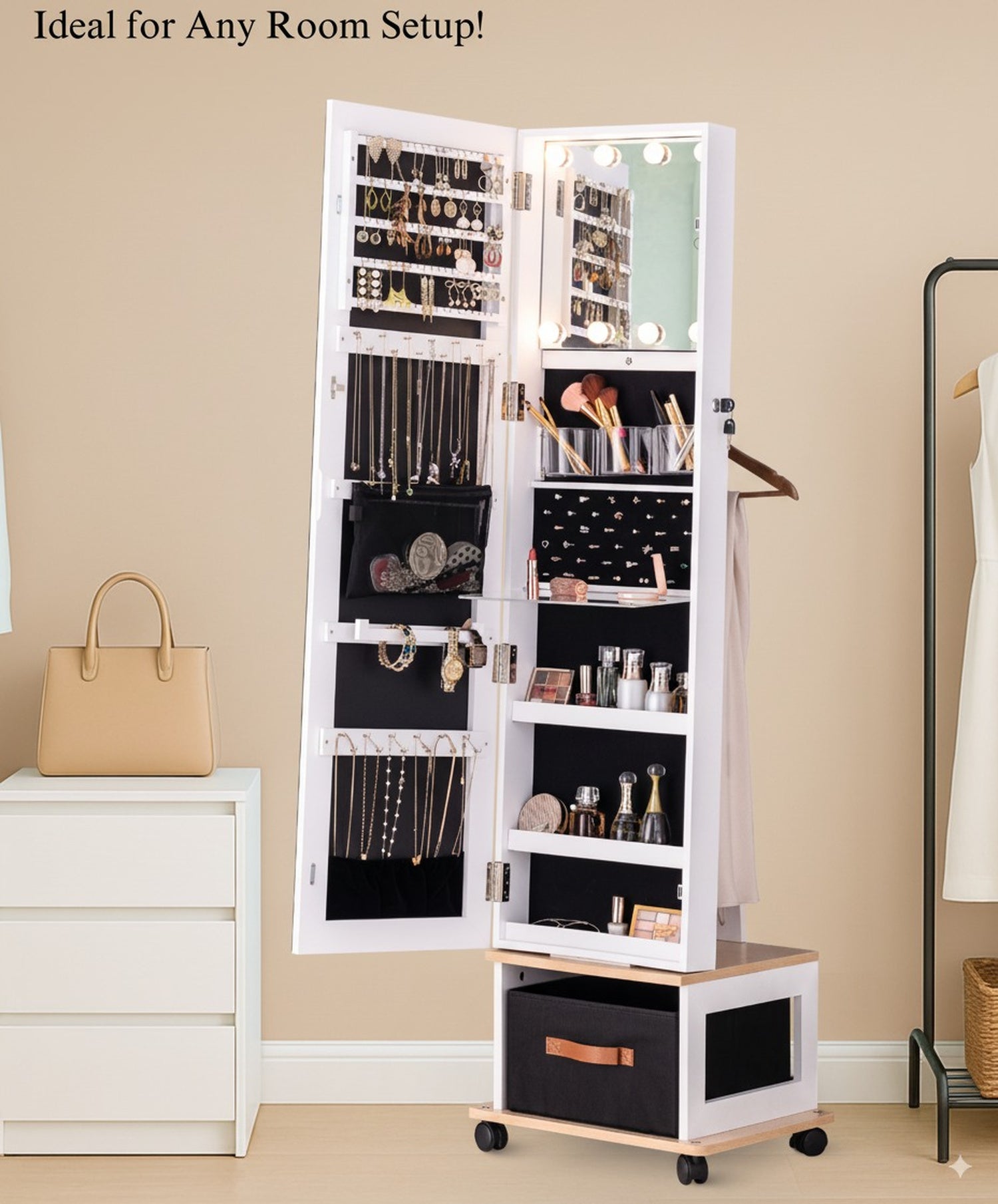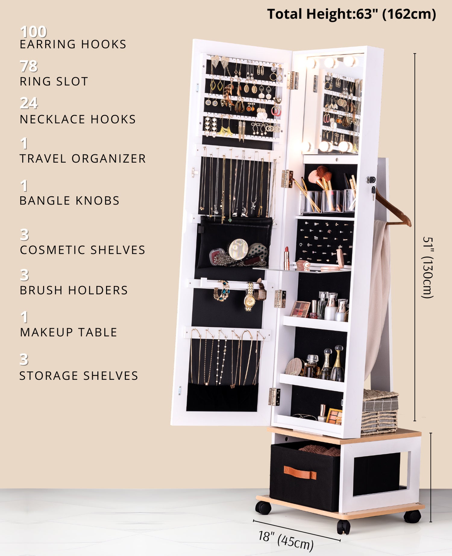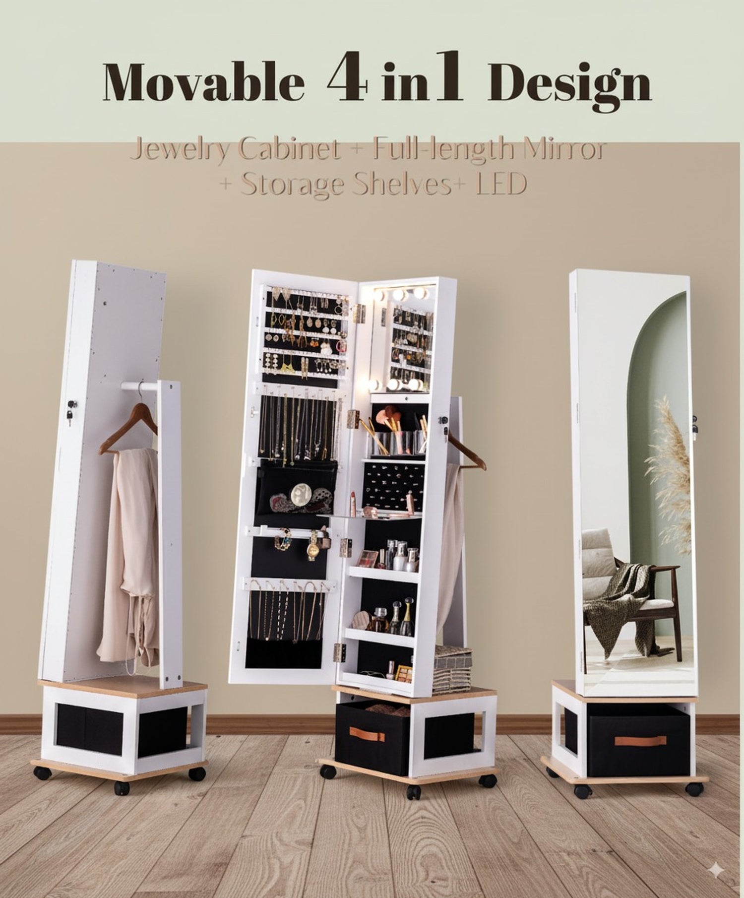 4-in-1 Swivel Jewelry Organizer with Mirror – Experience the convenience of a movable rotating jewelry armoire that combines a full-length mirror, generous storage compartments, and built-in LED lights. A modern organizer that keeps accessories and beauty products in one elegant solution. Smooth Mobility with 4 Heavy-Duty Floor-Safe Wheels – Easily roll your rotating jewelry cabinet wherever you need it. The sturdy wheels glide effortlessly while protecting your floors, allowing you to reposition your mirror organizer without lifting or scratching surfaces. 8 LED Lights Rotating Mirror with Storage – Brighten your daily routine with eight high-quality LED lights designed for flawless makeup application. This swivel mirror jewelry cabinet doubles as a storage solution, blending radiant illumination with functional elegance. Spacious Extra-Large Rotating Mirror Cabinet – Crafted for jewelry lovers, this standing armoire provides a full-length mirror and extensive storage for necklaces, rings, earrings, and more. Say goodbye to clutter and showcase your collection in a refined, organized way. Integrated Brush Holders, Makeup Table & Bottom Storage Shelves – Keep brushes, cosmetics, and accessories neatly stored with dedicated holders and a convenient makeup station. The bottom storage box with three cosmetic shelves offers additional space for beauty essentials, jewelry, and hair products.