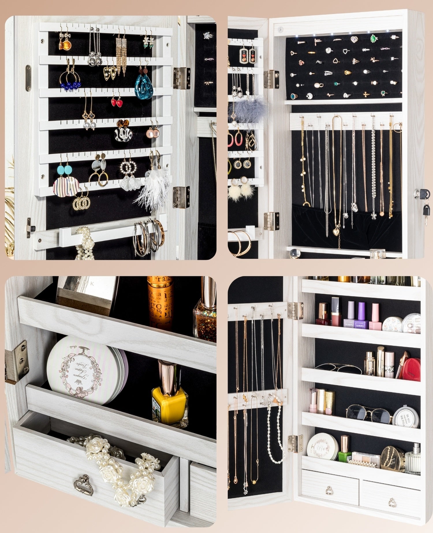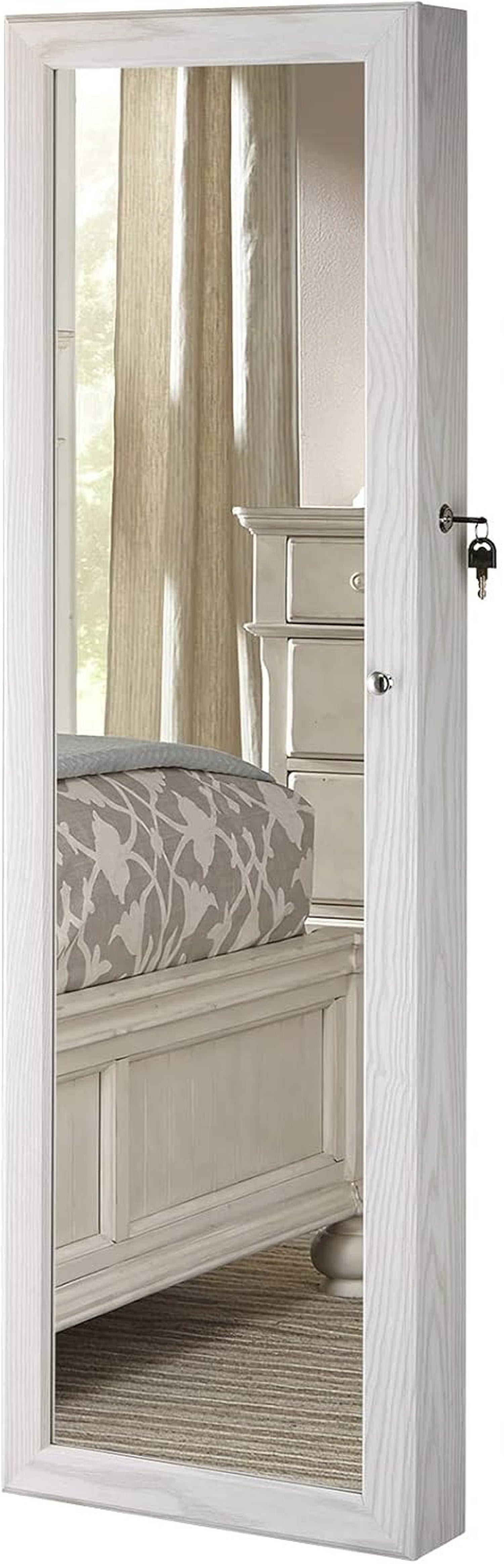 Full-Length Mirror Armoire – Stylish full-size 47"H x 14.5"W x 3.9"D glass mirror provides a clear, wide reflection while keeping jewelry and accessories hidden inside a sleek modern cabinet : Features 78 ring slot & 2 Bangle Knob, 2 drawers, 5 cosmetic beauty shelves, 36 necklace hooks & 120 earring slots. Ample space to organize jewelry, skincare, bracelet bars and makeup. : Auto Activated Instant Glow, Built-in LED lights (AAA batteries not included) brighten your collection, making it easy to find pieces in the dark while showcasing your gems with elegance and clarity. : Easily mount to the wall or hang over the door with 3-point height adjustment. A practical design that saves space while keeping your jewelry safe and accessible. : A thoughtful holiday, birthday, or anniversary gift for women. This jewelry cabinet with mirror combines organization, storage, and elegance, ideal for wives, mothers, and daughters.