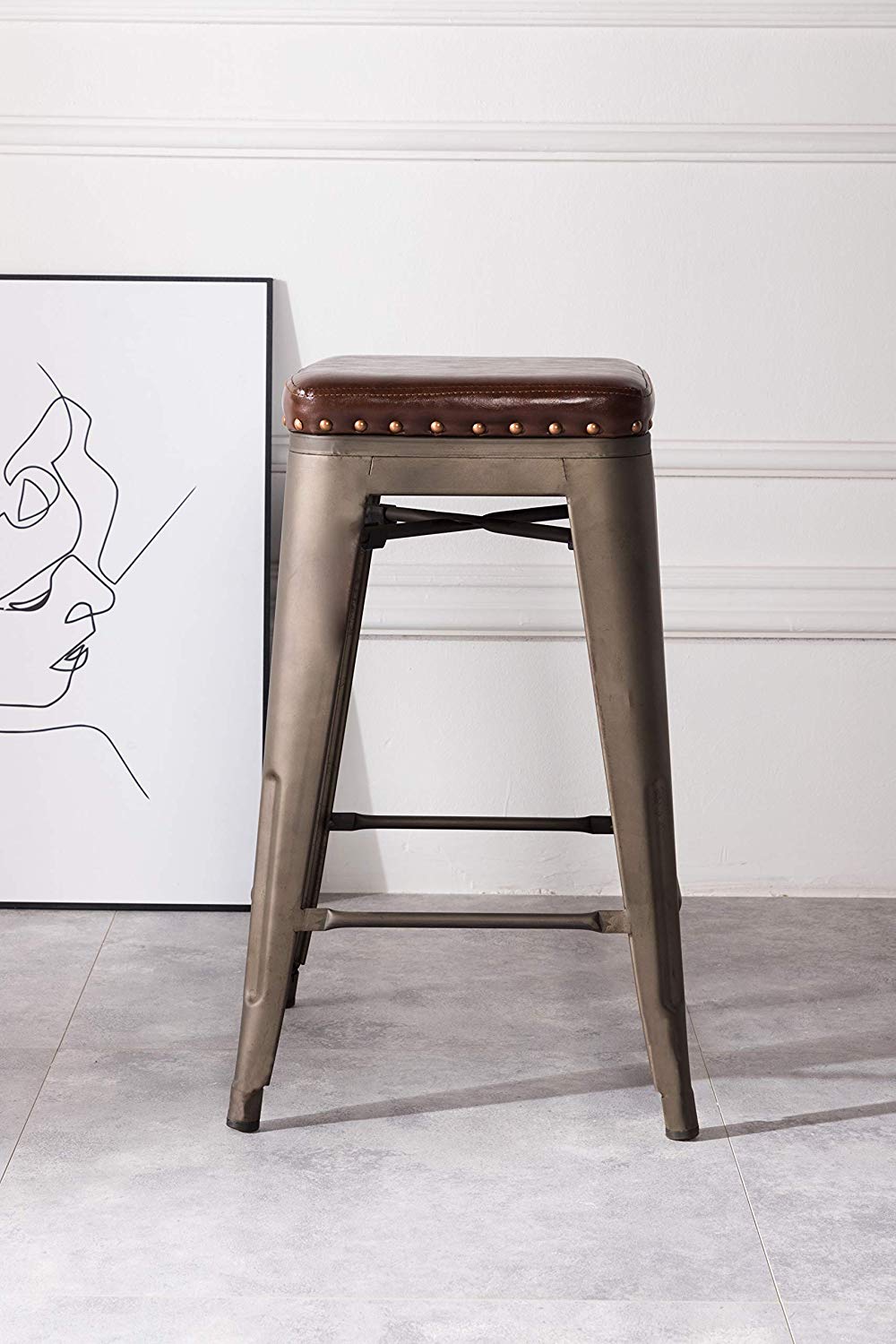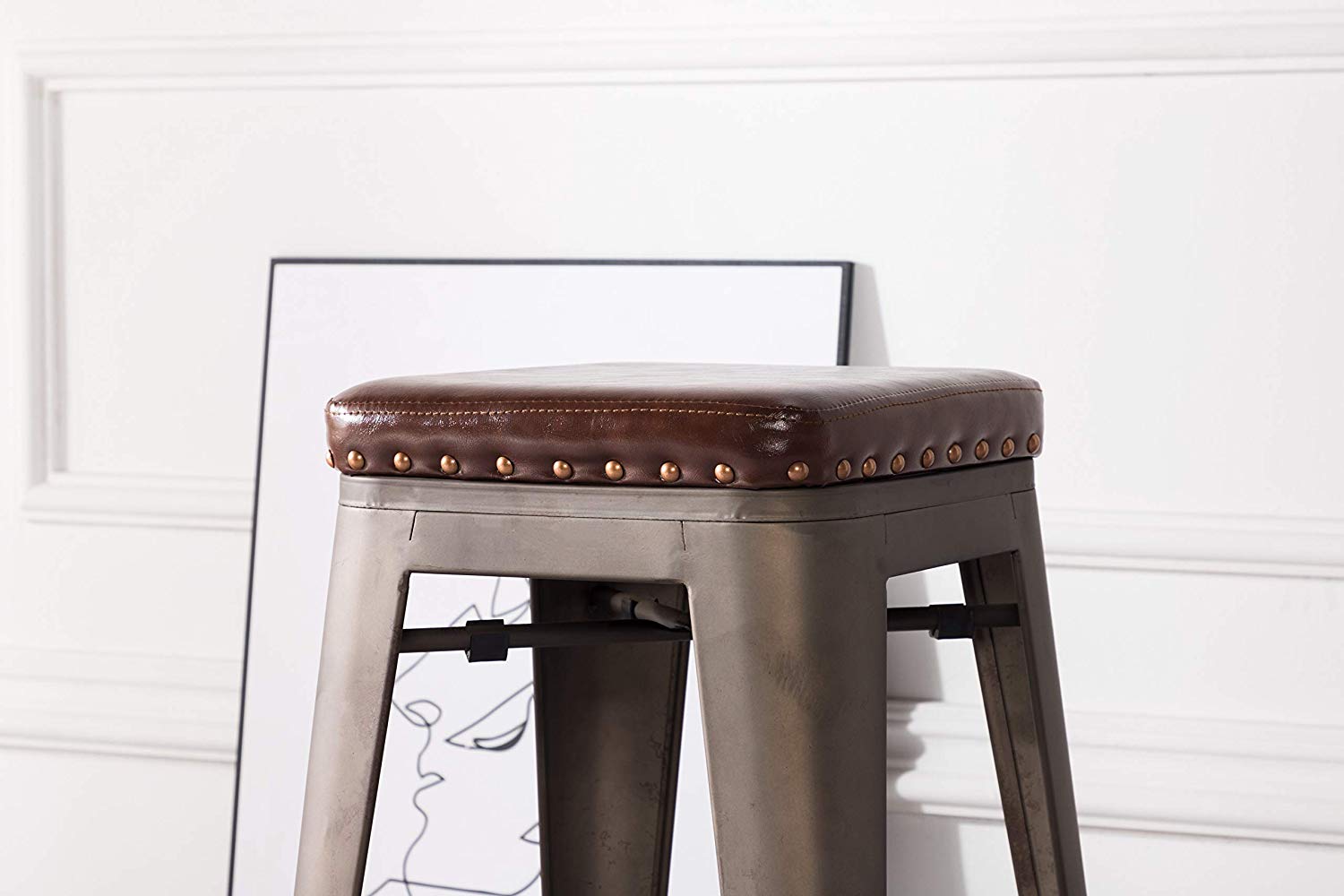 Built to last long, Ideal for any kitchen or bar area, 24inch stool with vintage padded PU Leather and charming textured upholstery, these Industrial accent nail headed stools are made of Distressed finish solid legs, well-padded seats and nailhead trim on a durable frame. Built to last long, Ideal for any dining table, with crisp lines and a charming textured upholstery on the seats .