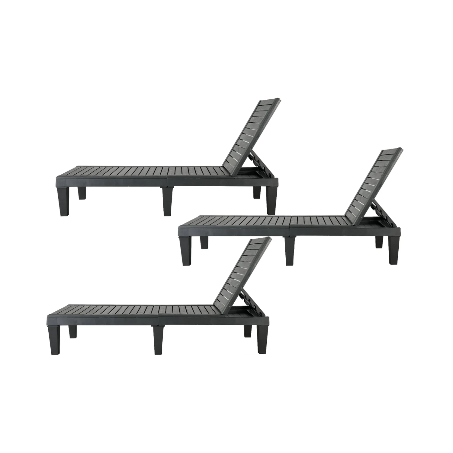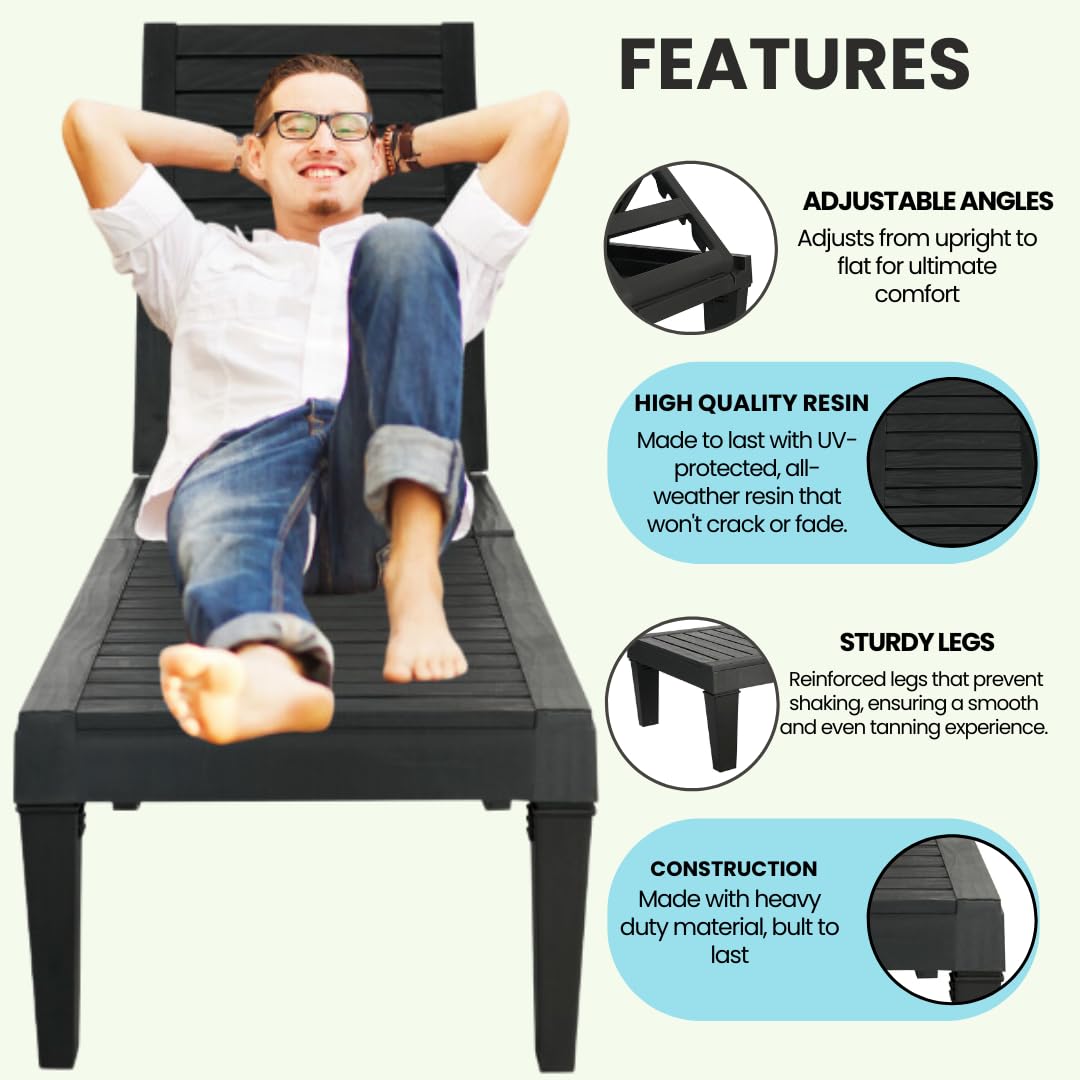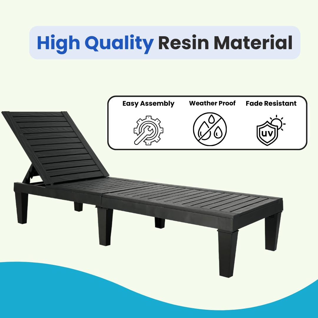OUTDOOR CHAISE LOUNGE: Reclining Chaise lounger is the ideal poolside chair with backrest in FIVE ADJUSTABLE POSITIONS. The recliner settings ensure you'll finish your summer book list, lounging by the pool with your family and get an even tan at the same time on this patio lounger tanning bed, from slightly reclined to fully flat for afternoon naps. Resting positions, whether sunbathing, sleeping, gaming, spa, napping, chatting, or reading, you can find the most comfortable angle. PATIO LOUNGE CHAIR: Keep your pool space clean & attractive with this stylish Sun lounger made of all-weather, Anti-aging material good & looks great for years to come. Decorate for a stunning look in any patio, garden, beach, backyard, balcony, swimming pool, camping, fishing, or other places to enjoy your time. Outdoor Lounge Chair comes with the breathable slat design for cool seating even in hot summer. Patio chairs can be used as a beach lounge chair, an indoor or outdoor recliner chair. OUTDOOR POOL CHAIR LOUNGER features a 21lb Lightweight modern folding structure for compact & stackable storage when not in use, Portable & easy to carry and transport to the beach, camping or wherever you want. Quick Easy Assembly: Set up this patio chaise lounge, outdoor or indoors with no screws or tools needed in just 3 easy steps for less than a few minutes. Fully Reclined: 11.5” H x 22.8” W x 74.25”L. Fully Upright: 33”H x 22.8” W x 74.25”L. Adjustable Backrest Height 11.5"~18"~24~29~33"(H). POOLSIDE LOUNGER made of sturdy and environment friendly recyclable resin material. This outdoor-friendly Lawn chair is solid & will not bend, rust, peel or break easily, ensuring years of enjoyment. Stop worrying about the erosion by the rain for year-round use, it can also effectively prevent ultraviolet radiation & corrosion. No more surface sealing. UV protection helps maintain the sun bed appearance and structural integrity over time for long lasting use. Easy Cleaning, Simply wipe or wash.