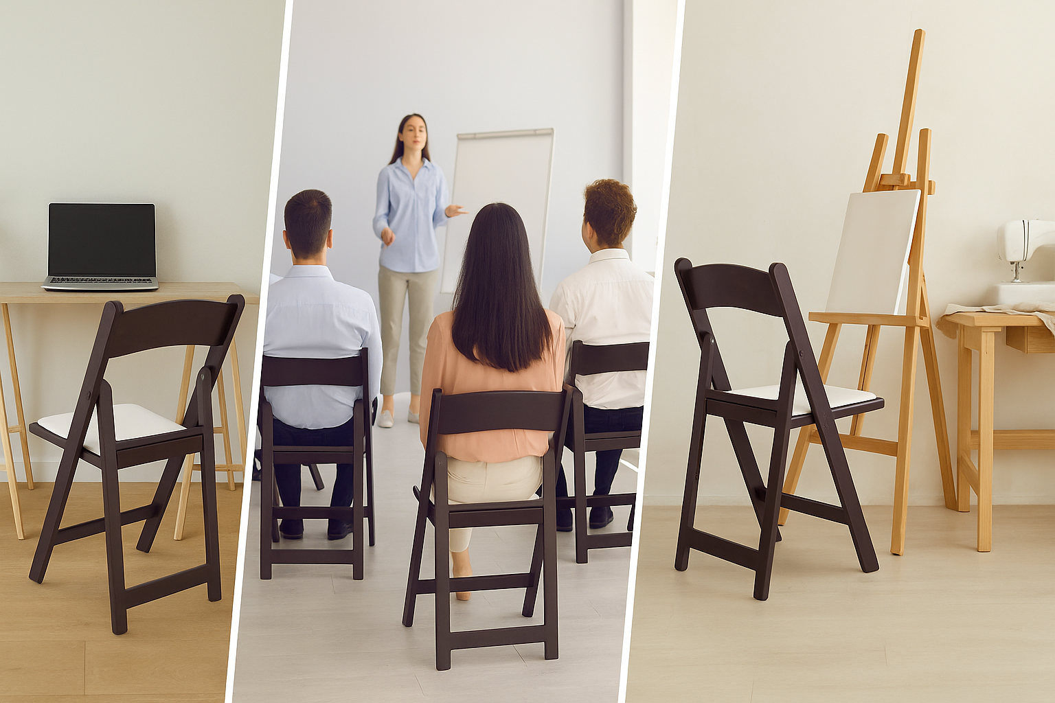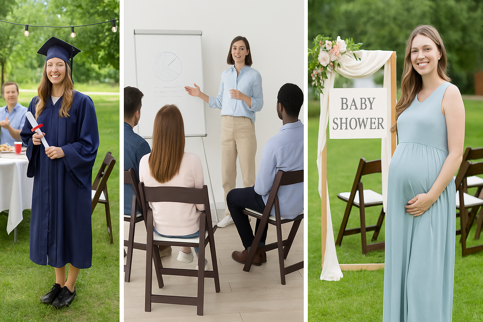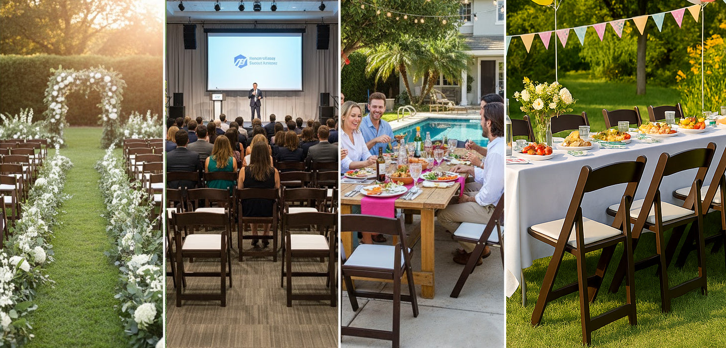 Resin Folding Chair - a stylish padded seating solution for VIP guests at your memorable occasions. Chairs are made of resin material, which is UV stable, resistant to aging, aluminum hardware, ensuring that this chair will stay looking fresh and new for years to come. Whether you need extra seating for a party, a comfortable place to sit during a sporting event, or indoor or outdoor gatherings, the chair is a reliable choice & easy to carry. SUPER STURDY & DURABLE:Built to last. Dual support braces with footrest & a smooth frame, adding to the overall stability and strength of the chair.  Removable padded Cushion seat pad which is waterproof and is washable. FOLDnStack:These can be stacked in a foldable position. Nested together, Ideal for easy storage, transportation & organization. Smart choice for residential - commercial, indoor outdoor use. Event chair comes with sleek design which make it suitable for indoor outdoor use in either simple or professional settings such as home, rental business, restaurant, baby sittings, banquet hall, patio or dining room, at weddings or other formal events to provide comfortable & stylish seating. EASY TO USE, CARRY, CLEAN, SAFE & COMFORTABLE: Fold open very easily. And to close them is simple also. No assembly required. Overall, the Folding Chairs are a reliable and attractive seating solution that can be used in a wide range of settings. Its non-slip plastic feet give stability & anti-scratch protection. Overall Size: Chair measures 17.5in W*18in D*30.75in H weighing at 9lbs Folded dimensions of 17.5*25*2.25inch . Seat Size: 15.5"W x 13.75"D x Seat Height 18.5"H. Back Size: 17.5"W x 15"H They come totally assembled. Dynamic weight capacity of 250lbs & static weights of up to 1000 lbs. Straight out of the box and ready to be used. Its compact size & ability to fold make it an excellent choice for use in church, prayer halls, where they can be easily stored when not in use.